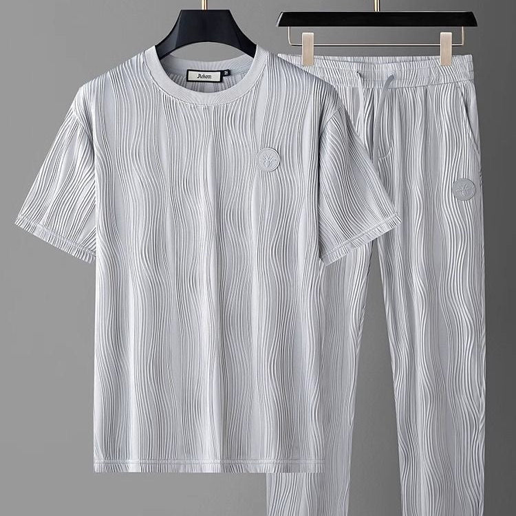 Sculpted in soft pleats with a wave-like texture, this two-piece set redefines comfort with architectural elegance. The lightweight fabric flows with every step, while the tonal emblem adds a subtle, elevated finish.
